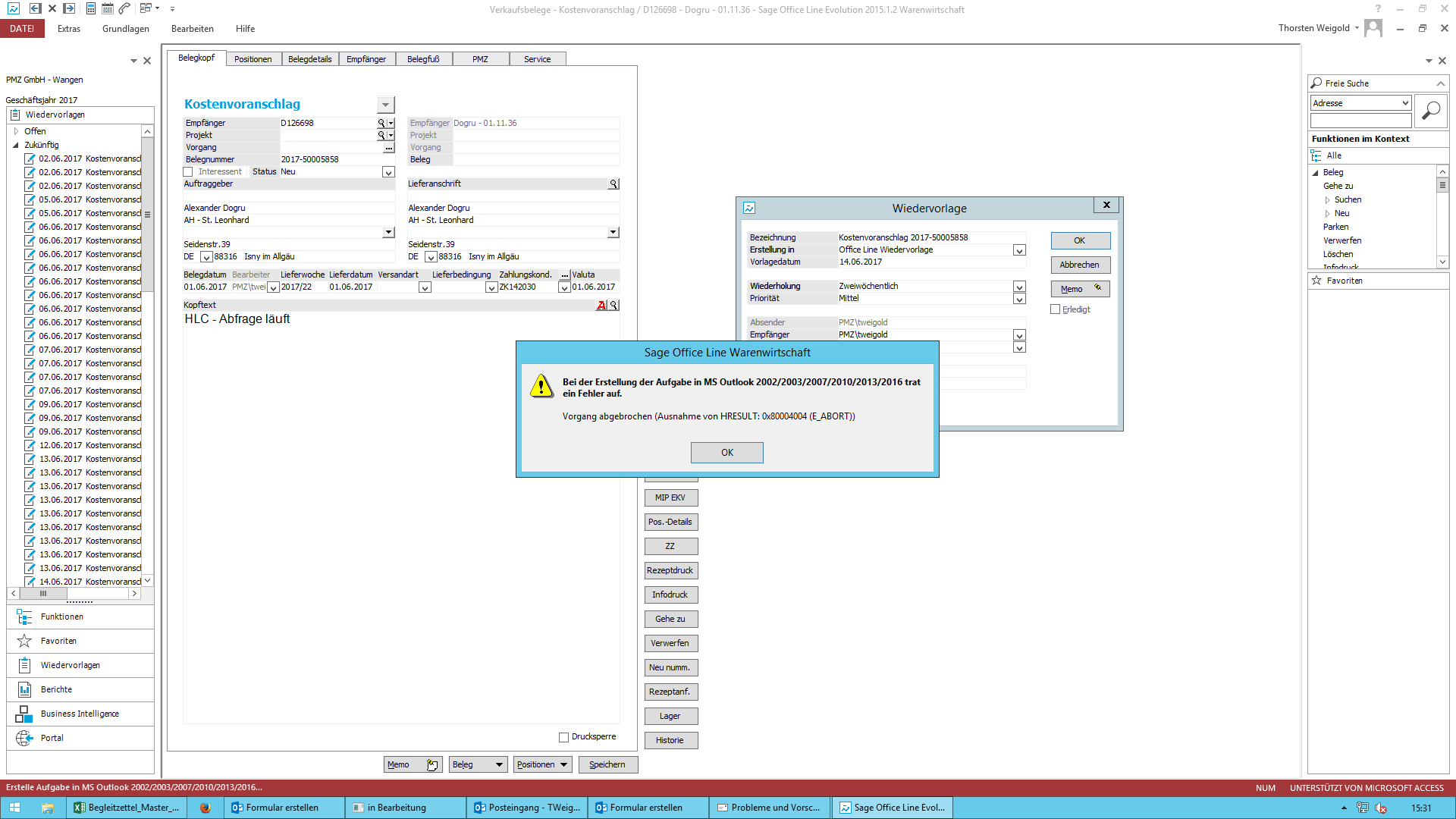 Beim Erstellen der Wiedervorlage "Kostenvoranschlag" kommt beim Speichern wieder diese Meldung . Wenn diese Meldung offen ist kann auch der Reiter auf dem Desktop für die Probleme und Vorschläge nicht geöffnet werden. Wohl eine kleine Nebenwirkung!